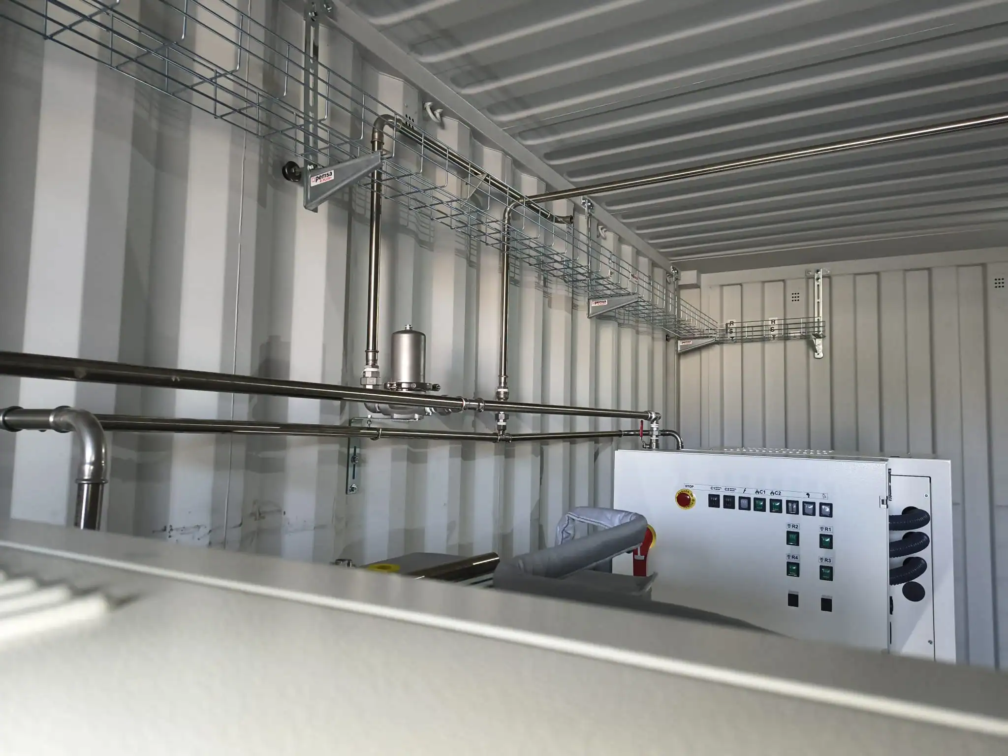 La clé du projet a été le format de livraison : l’ensemble de l’unité a été prémonté et assemblé dans un conteneur maritime de 20 pieds dans les installations de Giconmes à Saragosse, y compris la tuyauterie de distribution en acier inoxydable, le panneau de contrôle électrique avec un contrôle indépendant pour chaque réacteur et toutes les connexions étiquetées.